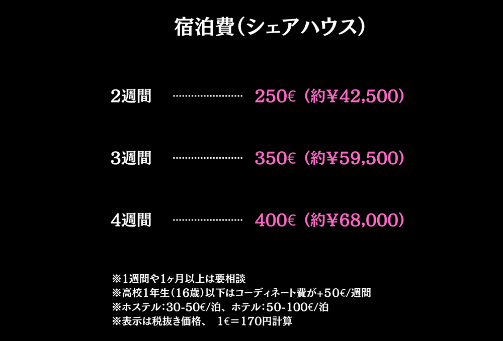 ※シェアハウスに空きがない場合はホテルかホステルの宿泊になります