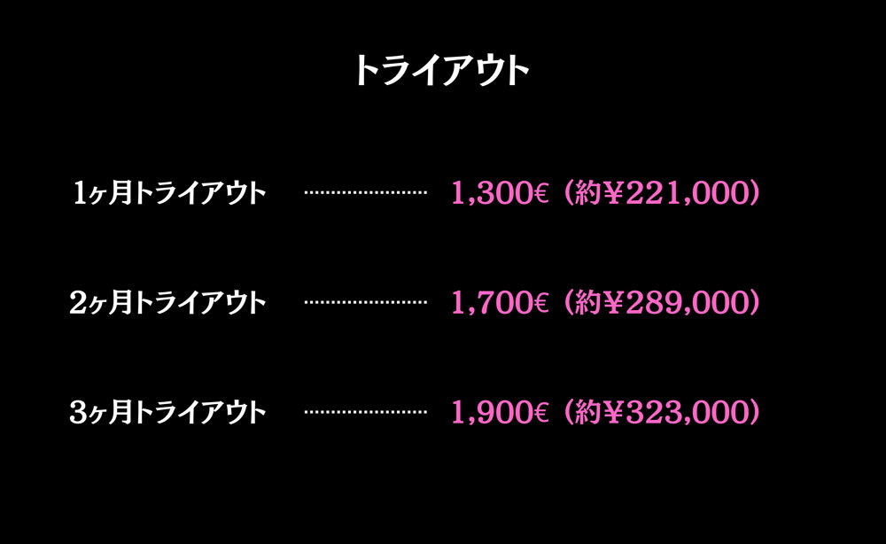 特徴は、契約をトライアル期間(1ヶ月か3ヶ月)とシーズン期間に分けている点です。なぜなら、選手の中で「留学だから」と意気込み、日本出発前に多額の費用を一括で支払ってしまったため、納得の行かないまま留学を続けているケースが目立つからです。現地の生活になじめない。自分の条件に合ったチームが見つけられない。だけどもう支払いを済ましてしまった。そんな悩みを解消するため、あえてトライアル期間とシーズンの契約を分けました。 ドイツに渡航してからは海外経験の長い日本人スタッフがドイツに駐在しており、サッカーに必要なサッカー用語、サッカーに必要なメンタルトレーナーからのアドバイス、栄養士からのアドバイス、ドイツ人スタッフ(ドイツサッカー協会A級ライセンス保有/ドイツ国内で2番目に高い指導者資格)からのアドバイスを受けることができます。